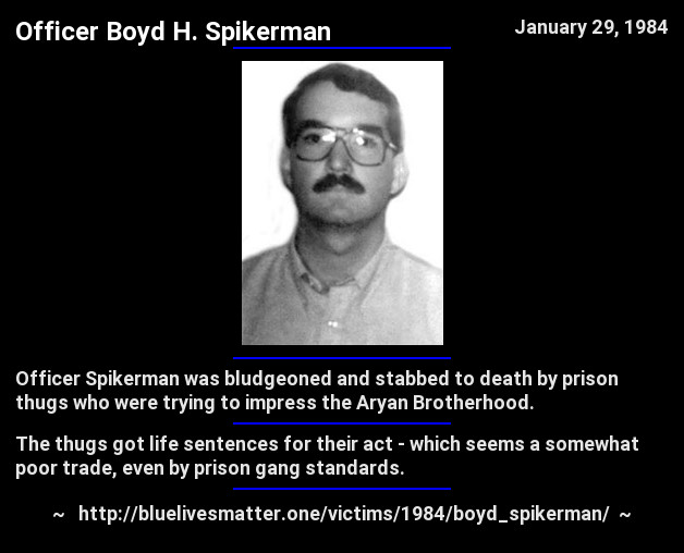 41 years ago today, Officer Boyd H. Spikerman was murdered by thugs trying to impress the Aryan Brotherhood.