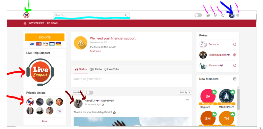 As far as basic site navigation, The little donkey (green arrow) takes you to the main feed, Your Icon (the blue arrow) takes you to your wall (Profile page), the little pink lines, from left to right are Friend Requests, PM's, Notices and Profile Settings. Selecting another Icon (Red arrow) takes you to that member's wall, in this case Admin's where on rare occasions you might actually find something useful ( Just kidding Admin) Also indicated with the Red Arrow is the Live Chat with Admin. The Light Blue is the Search Bar and The maroon arrows are Harrell who just got a new puppy, Tess, that's her in the icon. We are looking forward to lots of stories.
