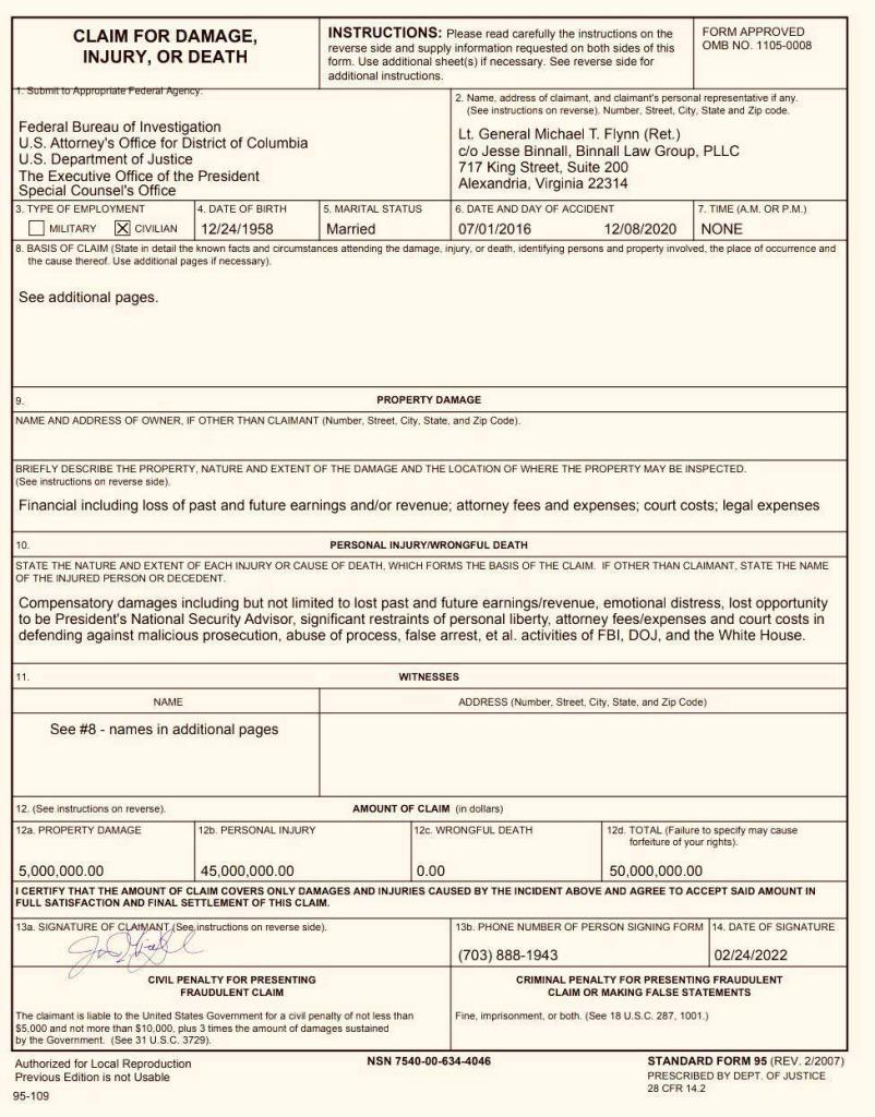 General Flynn has filed a $50 million claim against the DOJ, FBI, Obama WH and Special Counsel Robert Mueller for malicious prosecution.