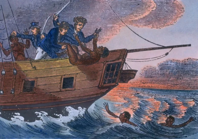 The crew of the slave ship Zong cast African captives into the sea in an effort to obtain insurance compensation. The image is an eighteenth-century engraving from 1782 with contemporary color added.