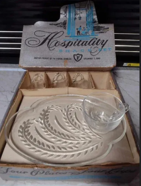 Vin... View MoreFederal Glass Hospitality Snack Sets in Homestead Wheat Pattern . The reason why I say "new". The way it looks, it has never been used. Though, as you can see by the box, it has had a shelf life.