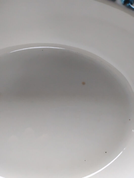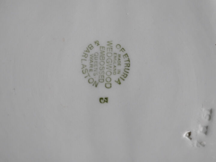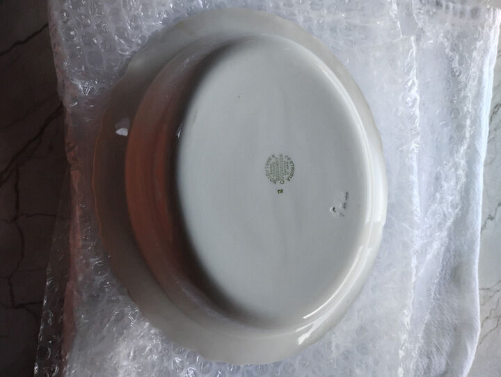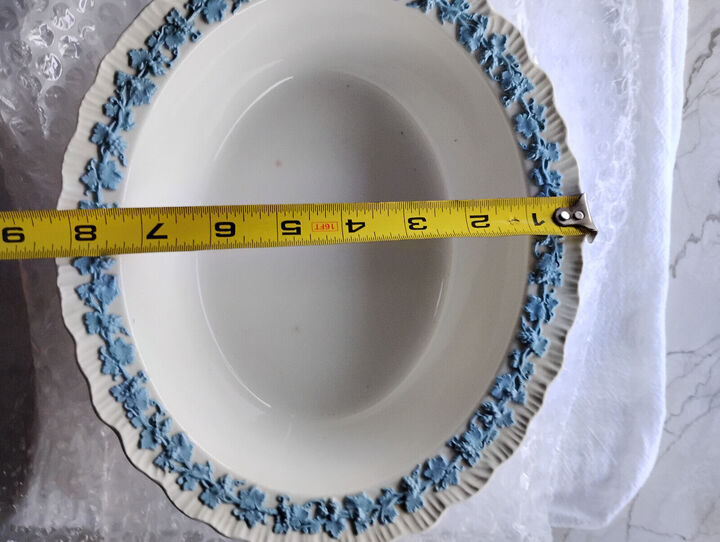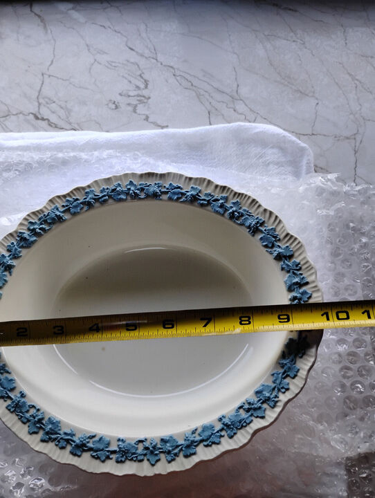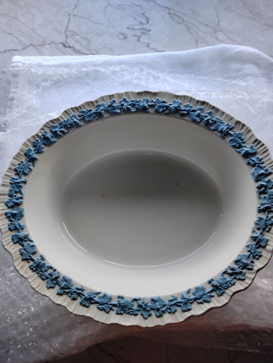 There are 2 light brown spots you will view them in a picture. In very good condition for age!... View MoreMade In England Embossed Oval Serving Bowl. Off White Blue Porcelain. Grapes and vines, 1940'S.