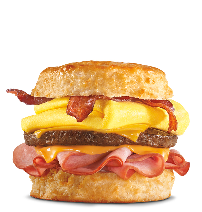 Try Hardee's Monster Biscuit!!! Slighty crunchy yummy biscuit, bacon, sausage patty, ham, cheese, scrambled egg, ?mayo? - Good Lord what a sandwich, literally to Die For!