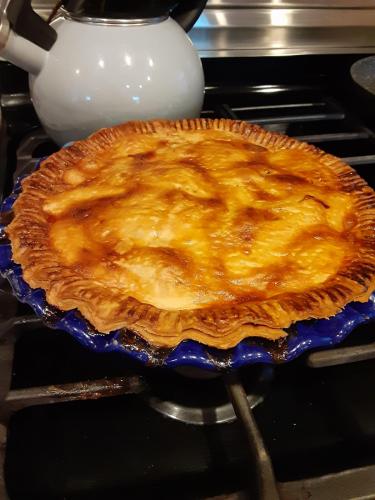 One apple pie baked and cooling. 2nd one in oven now. 2 pumpkin pies to make yet. Maybe some cookies too.