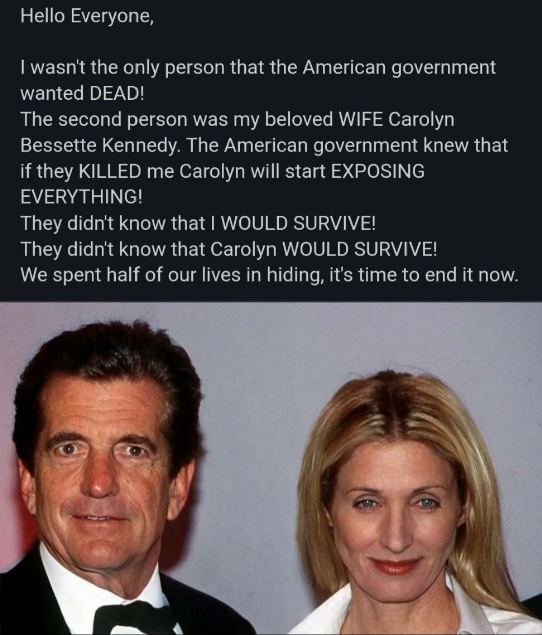 GOES OUT TO JFK JR. & Q .... WHERE EVER YOU ARE TODAY, ITS TIME TO REAPPEAR SO PUBLIC CAN WAKE UP ... ITS TIME !!.... PLUS WE NEED TO GO HAVE A BEER SIR ..... YOUR LOYAL FRIEND CSPOA