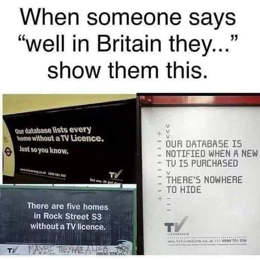 JimJimmyJames Yes, many British TV Shows 1960s to 1980s like "Are You Being Served?" and "Mind Your Language" talked about mandatory TV licences... The British (just like CCP China and Japan) is flooded with street camera and Internet Surveillance, so this make PERFECT sense!