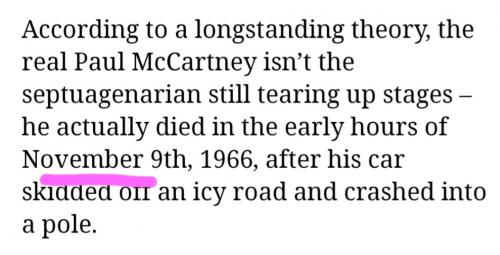 OK NOW TO THE NUMBERS : ....... PAUL McCARTNEYS ENTIRE FAMILY ARE FREEMASONS. HIS UNCLE IS A 33 DEGREE MASON.. IN 64' PAUL WAS HAVING DETAILED NIGHTMARES EVERYNIGHT.. PAUL WENT & TOLD HIS UNCLE, SO AS SEP WAS FAST APPROCHING PAUL & HIS UNCLE STARTED PLANNING IN CASE HIS TRAGIC DEATH IN A CAR EVER C... View More