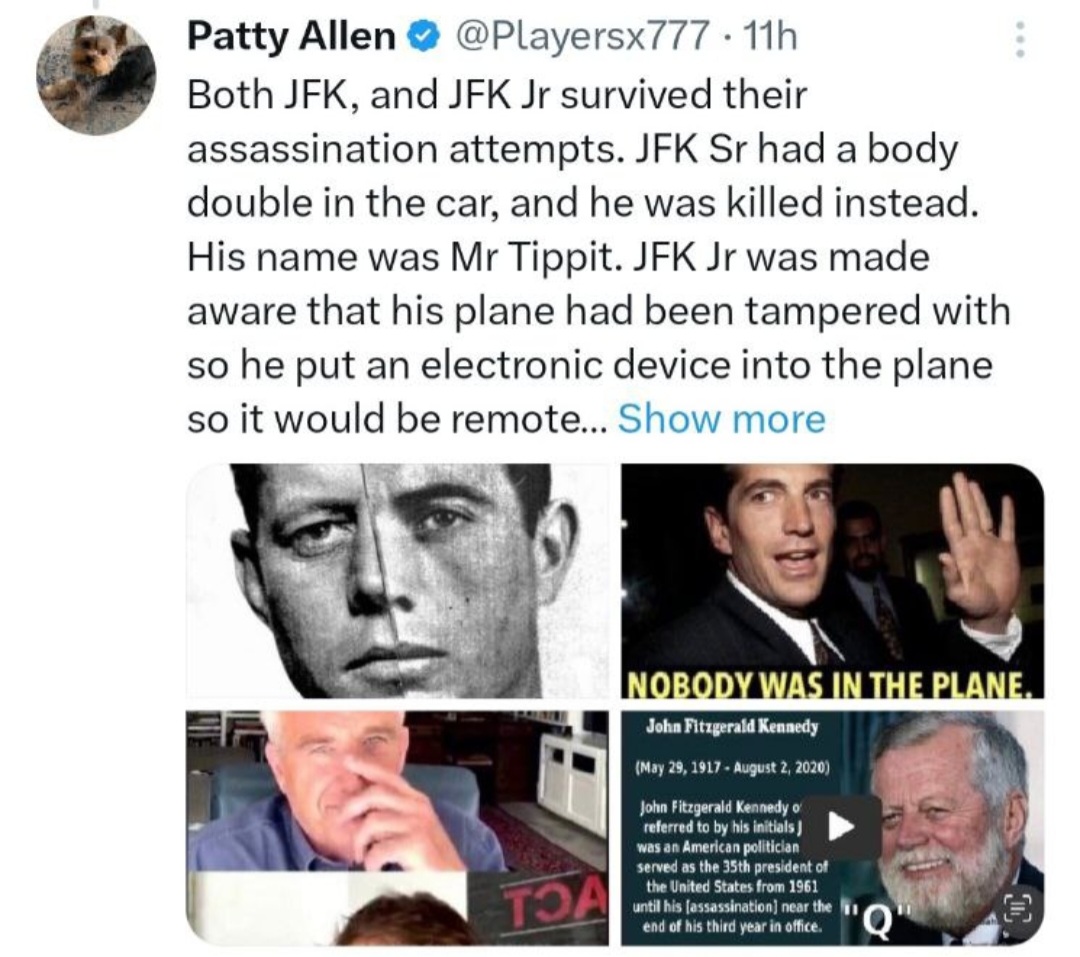 REGUARDING THE NEWS CAST THIS WEEKEND, "" TRUMP FAMILY WILL HAVE TO DISCLOSE DJT IS GONE ""..... WHY DID THAT COME OUT NOW ??????.....TRUMP HAS BEEN BOOKED 4 TIMES IN 2023' THEY HAVE FINGER PRINTS .....& YET TRUMP HAS GOT OFF ON ALL COUNTS π....... SEE WHERE I AM GOING HERE π€...... IF ITS NOT TRUMP YOU CANT PROSICUTE TRUMP π..SO THE REAL QUESTION IS ........ WHO IS IT π€.....MY MONEY IS ON JFK JR