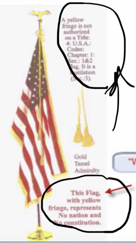 The gold or yellow fringe flag is your WARNING that you are leaving your Constitutionally protected rights on the floor outside the door of that courtroom. This is why so many judges are appointed, and not elected by the people. Federal judges are appointed by the President, the national military co... View More