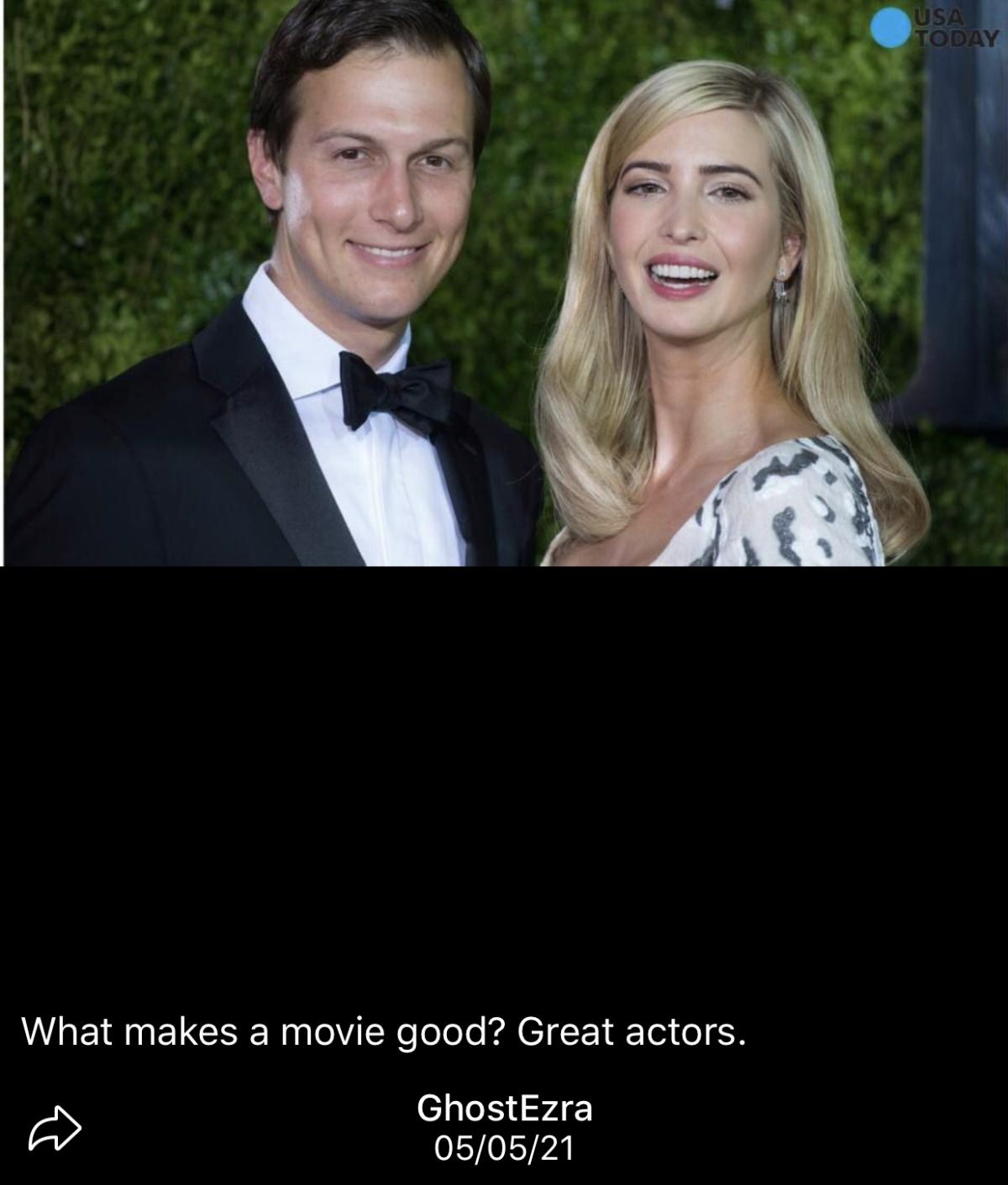 Eagle-Soul - βοΈ π‘ZβWELL -48 SAYS BOTH IVANKA & JARED HAVE BEEN KEPT OUT OF PUBLIC EYE ...... THAT EXPLAINS OTHER PIC WHERE HE SAYS GREAT ACTORS π€π€π€